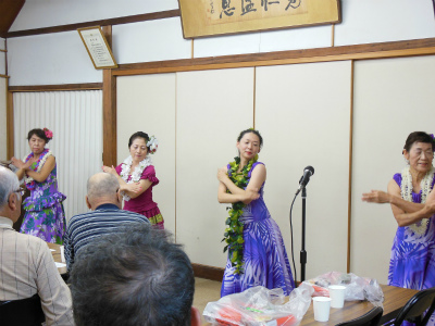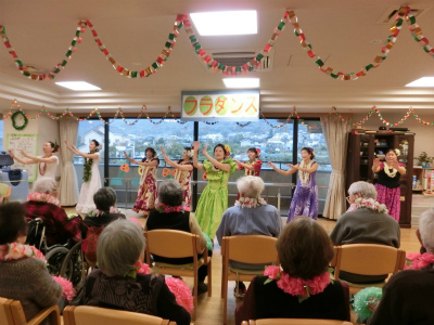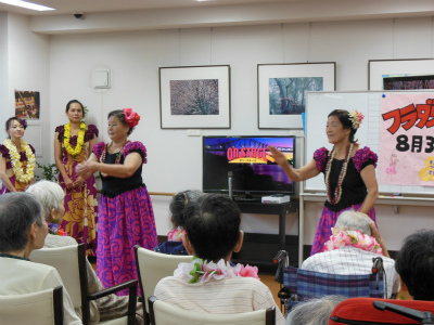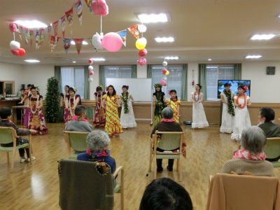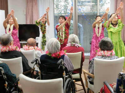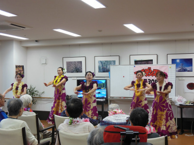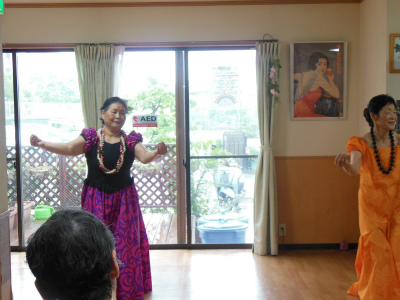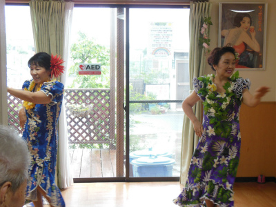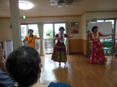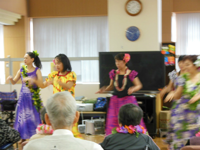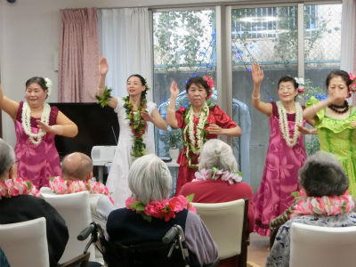 今回も元気で明るい職員の方々と明るくお元気そうなデイケアサービスに来られている皆様に迎えられ、約1時間ご一緒に楽しんで頂きました。最後は「マハロ~」の声に見送られ、私たち皆元気を頂きました。本当にマハロ~